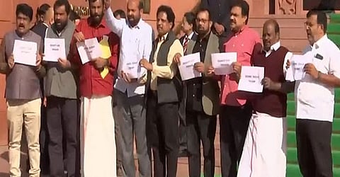 New Delhi: Opposition MPs on Thursday held a protest in Parliament premises against External Affairs Minister (EAM) S Jaishankar's statement in Rajya Sabha, on the deportation of Indian nationals from the United States on February 5.