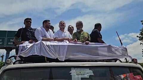 Gandhi joined RJD's Tejashwi Yadav in Patna against the ongoing electoral roll revision drive by the Election Commission of India (ECI).