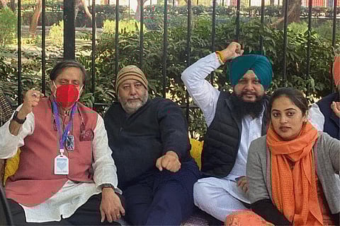 NEW DELHI: Congress MP Shashi Tharoor on Sunday joined the protest staged by his party colleagues from Punjab at Jantar Mantar in demanding the withdrawal of the new farm laws and holding the Winter Session of Parliament.