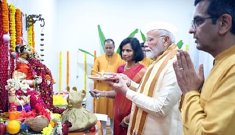 New Delhi: Prime Minister Narendra Modi visited the residence of Chief Justice of India (CJI) DY Chandrachud on Wednesday, to take part in the Ganesh Puja celebrations. In the pictures that went viral on social media, PM Modi was seen offering prayers to Lord Ganesha and performing aarti along with the CJI and his wife.