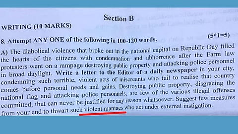 Drafted under section B of the exam paper, the question read: "The diabolical violence that broke out in the national capital on Republic Day filled the hearts of the citizens with condemnation and abhorrence after the farm law protesters went on a rampage destroying public property and attacking police personnel in broad daylight. Write a letter to the Editor of a daily newspaper in your city, condemning such terrible, violent acts of miscreants who fail to realise that country comes before personal needs and gains. Destroying public property, disgracing the national flag, and attacking police personnel are few of the various illegal offences committed, that can never be justified for any reason whatsoever."