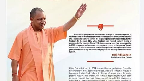 The advertisement "Transforming Uttar Pradesh Under Yogi Adityanath" carried on Sunday in an English language publication has a cut-out of Mr Adityanath with a flyover that resembles Kolkata's "Maa flyover" that connects the central part of the city with Salt Lake and Rajarhat located in the northeastern fringes of the city. The image also has Kolkata's iconic yellow taxi and a high rise that resembles a five-star hotel in the city next to the Maa Flyover.
