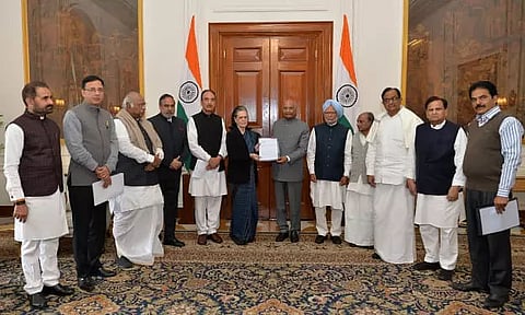 NEW DELHI: Congress delegation led by Congress President Smt. Sonia Gandhi & Former Prime Minister Dr. Manmohan Singh met with Ram Nath Kovind, President of India, to present a memorandum on the Delhi violence.