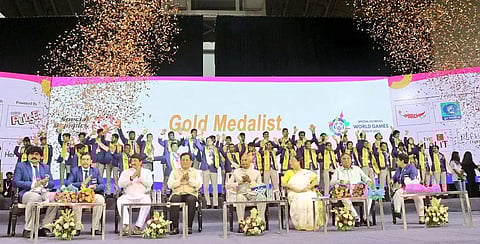NEW DELHI: A welcome ceremony was hosted on Tuesday by Special Olympics Bharat at the Jawaharlal Nehru Stadium, New Delhi for the special athletes who made India proud at the Special Olympics World Summer Games 2023 hosted in Berlin. The Indian contingent displayed an impressive performance during the world games and returned with 202 medals, which includes 76 gold, 75 silver and 51 bronze medals. The athletes received a token of appreciation amidst a huge round of applause from the gathering.