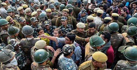 New Delhi: Angry JNU students targeted police with “Tis Hazri, Tis Hazari” slogans after the police allegedly pushed some students, including women, who were holding a massive protest outside the campus gate on Monday, which saw Union HRD Minister Ramesh Pokhriyal unable to leave the varsity after a convocation event.