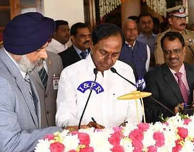 Hyderabad: K. Chandrashekhar Rao, who led the Telangana Rashtra Samithi (TRS) to a landslide victory in Assembly elections, on Thursday took oath as the Chief Minister of Telangana for a second term in a row. Governor E.S.L. Narasimhan administered the oath of office and secrecy to the TRS leader at 1.25 a.m. at a ceremony held at Raj Bhavan. Mohammed Mahmood Ali, a member of Telangana Legislative Council, also took oath as a Minister. Ali, who was Deputy Chief Minister in the previous cabinet, is likely to retain the same post.