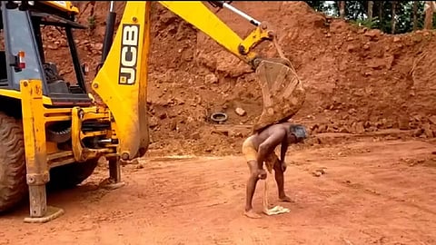 While sharing on Facebook by a user called Abdul Nasar, the 41-second clip features a man standing at a construction site next to a JCB that is parked at a distance.