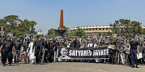 The MPs, also holding a huge black background "Satyamev Jayate" banner and placards with "save democracy" written on them, then proceeded towards Vijay Chowk where they staged a sit-in.