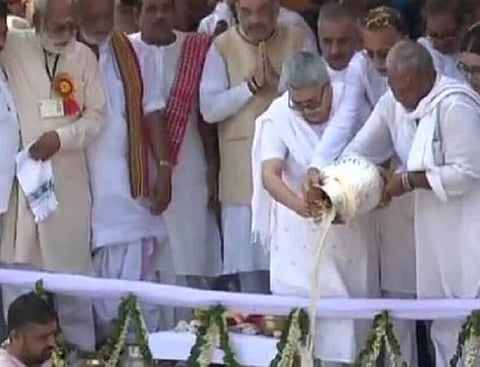 Haridwar, Aug 19: The ashes of former Prime Minister Atal Bihari Vajpayee were immersed by his foster daughter Namita in the Ganges here on Sunday. Among those who were present at the immersion ceremony in Har-Ki-Pauri ghat were Vajpayee’s foster grand-daughter Niharika, Union Home Minister Rajnath Singh, Bharatiya Janata Party (BJP) President Amit Shah, Uttar Pradesh Chief Minister Yogi Adityanath and Uttarakhand Chief Minister Trivendra Singh Rawat.