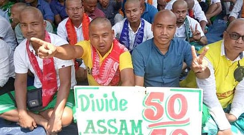 DHEKIAJULI, April 27: The ABSU, NDFB (P) and People’s Joint Action Committee for Bodoland Movement (PJACBM) observed ‘Betrayal Day’ in Dhekiajuli. The activists of these organizations observed a sit-in in front of the office of the Circle Officer of Dhekiajuli Revenue Circle. More than 200 activists took part in the protest. Kharumadao Wary, the assistant secretary of the ABSU, said that the Central Government had betrayed them by remaining silent on the issue of separate Bodoland. Later, the ABSU activists shaved off their heads at the protest site.