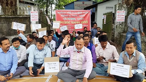 Dibrugarh, Feb 1: The members of Dibrugarh unit of Assam State Powers Workers' Union (ASPWU), protesting against ASEB authorities' move to hand over three 11 KV electric feeders, Bogibeel, Jokai and Sasoni to the private parties, staged dhar in front of the Chief Electrical Engineer's office of Dibrugarh division for more than one hour on Tuesday.