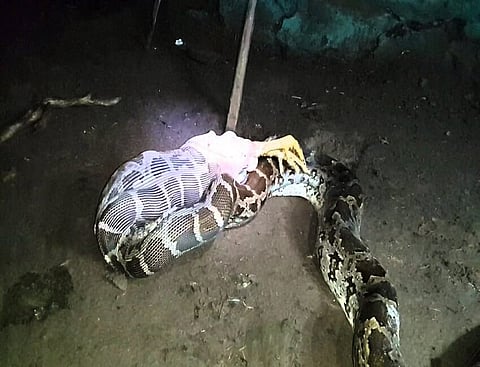 TANGLA: A 14-foot long python weighing 21 kg was rescued at Nalkhamara village in Udalguri district on Sunday night. A large number of villagers thronged the site to witness the reptile as it took hours of work for the forest officials to get hold of the python. Mrinmoy Hazarika of Dhansiri Forest Division, Udalguri led the rescue operation. It was later released at its natural habitat in Bornadi Wildlife Sanctuary.
