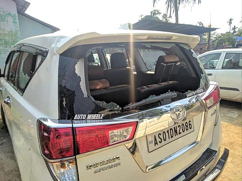 As per local sources, the vehicle of Congress leader Rockybul Hussain bearing registration number AS 01DN 2086 was completely vandalized.