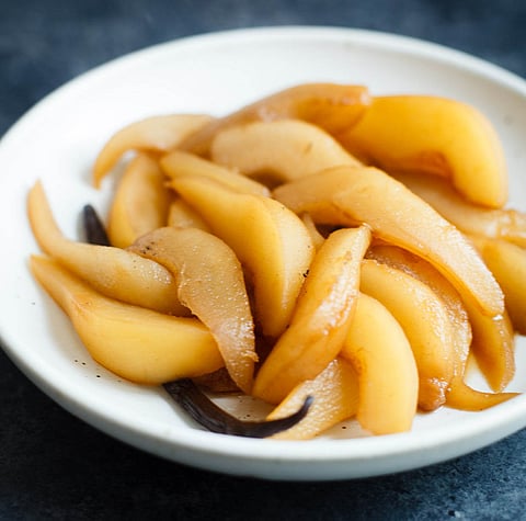 * Use a draining spoon to transfer the pears to a dish. Strain the strup into a small saucepan and boil until it is reduced to about 3 tablespoons. Spoon it over so the pears and allow to cool, then chill for 2 hours