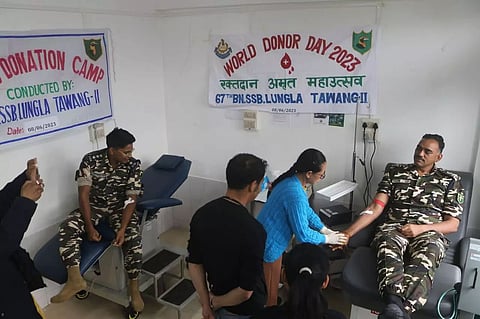 TAWANG: The 67 Battalion of Sashastra Seema Bal (SSB), Lungla, organized a blood donation camp at the Khandro Drowa Tsangmo District Hospital on Thursday. Led by its commandant, Atul Kumar Rai, and medical officer, Atulya Pratap Singh, seven jawans and officers of the battalion donated seven units of blood. Earlier at battalion headquarters, the commandant addressed the SSB personnel and informed them about precautions to be taken before donating blood and its importance in saving a life. He further appealed to all the family members of Jawans and officers of his battalion to come forward and donate blood on World Blood Donation Day on June 14 and contribute to making the blood donation Amrit Mahotsav successful.