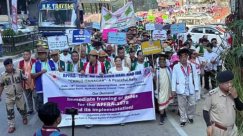 ITANAGAR: Thousands of Arunachal Pradesh's Indigenous people, representing 27 districts, 26 major tribes, and 100 subtribes, marched in traditional attire to Itanagar, the capital city, on Saturday to demand the implementation of the Anti-Conversion Act, APFRA 1978, which Christians in the state strongly oppose.