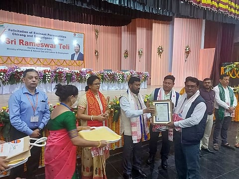 KOKRAJHAR: As part of the Azadi Ka Amrit Mahotsav celebrations to commemorate 75 years of India's Independence, Rameswar Teli, Minister of State for Petroleum and Natural Gas and Labour and Employment, Government of India, on Wednesday felicitated 75 citizens from Chirang and Bongaigaon districts, who have made significant contributions to the society and country through their personal efforts.