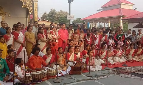 TEZPUR: Aagomoni programme on the auspicious occasion of Mahalaya was hosted by artistes of Binapani music and Art college at Mahabhairab Mandir premises, for the first time at the most famous historical Mahabhairab temple Tezpur. By asking the goddess to kill the demon king Mahisasura, who terrorised the world and murdered those who did not worship him, the ritual was done to awaken Maa Durga from her profound sleep. Deputy Commissioner Deba Kumar Mishra lit the inaugural lamp. Among other present were Gaya Prasad Agarwal DDC , Karabi Saikia Karan, CEO Zilla parishad, Pankaj Bora ADC.