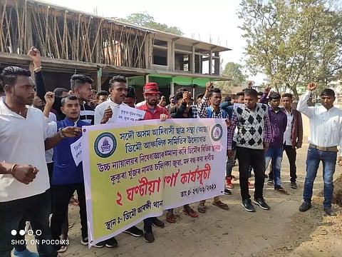 DEMOW: Under the patronage of All Adivasi Students Association of Assam (AASAA), Demow Regional Committee a demonstration was staged in front of Demow Police Station on Wednesday demanding steps to stop gambling in the name of cock fight.