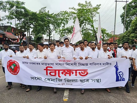 On the other hand, around 400 members of the Dhemaji district unit of AASU rocked Dhemaji town by initiating a protest rally regarding the same demand. The rally was taken out from Swahid Bedi premises covering the Dhemaji town and ended at the same place. During the procession, the protesters, by shouting various slogans, slammed the BJP-led Government of the State, Education Minister Dr Ranoj Pegu for taking the ‘destructive decision’ to destroy the Assamese and other vernacular languages of Assam. They demanded to scrap the decision at the earliest.