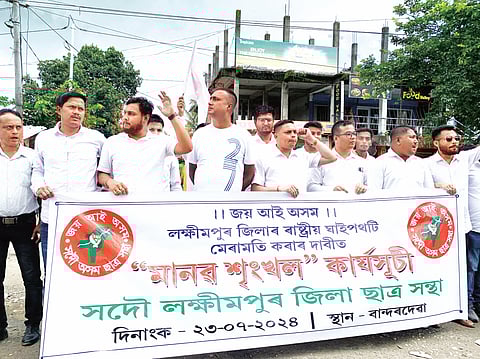 Regarding the issue, the Lakhimpur district unit of All Assam Students’ Union (AASU), led by president-in-charge Khirod Duwarah, general secretary-in-charge Punamjyoti Buragohain, staged a protest programme on Tuesday by demonstrating human chain to demand immediate repair of the dilapidated portion of the highway. While demonstrating the protest, the dignitaries of the organization made scathing attack on National Highway Authority, Government of Assam, Chief Minister Himanta Biswa Sarma and district administration alleging their dereliction regarding the repair of the highway. Lakhimpur AASU has demanded the authorities concerned to repair the deplorable stretch of the highway at the earliest. Otherwise, they have warned of initiating protest programme in the upcoming days. AASU central committee sports secretary Simanta Neog, Lakhimpur AASU adviser Faridur Rahman and more than 200 members of the organization representing all the regional committees under the Lakhimpur district unit took part in the protest programme.