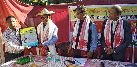LAKHIMPUR: The prestigious Aikyatan Sikshasevi Bota (Award) for the session of 2019-2020 was conferred to Dhaneswar Tamuli Phukan who is the founder headmaster of Hatilung High School and a prominent writer and a social activist of Lakhimpur district. Aikyatan, a voluntary social and academic organization of the district has conferred the award every year to a prominent personality who extends remarkable contribution for academic enhancement.