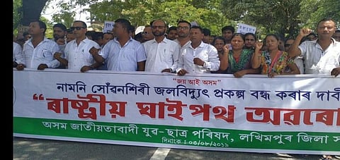 Strongly opposing the construction of the controversial river dam, the activists of the Lakhimpur district unit of Asom Jatiyatabadi Yuva Chatra Parishad (AJYCP) blocked the NH-15 between Pahumara and Ranganadi River bridge on Saturday. Shouting various slogans against big river dam, NHPC Limited, State Government and Union Government, the protesters demanded that construction of the LSHEP, which had been in halt from 2011, should be stopped. The organization reiterated its stand once again against the big river dam which was considered to be a water bomb to destroy the valley of Subansiri covering Lakhimpur and Dhemaji up to the island district of Majuli.