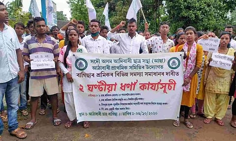 DEMOW: Under the patronage of All Adivasi Students Association of Assam (AASAA), Athabari Primary Committee, a two-hour demonstration was staged in Athabari Tea Estate near Demow on Tuesday to demand solution to various problems of labourers in the tea estate.
