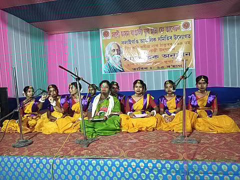 KALAIGAON: Under the patronage of All Assam Bengali Youth Student Federation (AABYSF), Kalaigaon Regional Committee, in association with Balipara Mahila Unit, Rabindra Jayanti was organized in Balipara Durga Mandir premises with a day-night programme on Wednesday. As per schedule, a colourful procession was taken out early in the morning. After that the main programme started with flag hoisting by Bikash Devnath, president of Kalaigaon AABYSF. The swahid tarpan was offered by Debashish Mandal, secretary of Udalguri district AABYSF. The ceremonial lamp in front of Rabindra Nath Tagore was lit by Biplab Das, assistant secretary of All Assam Bengali Youth Student Federation. Various competition like art, drawing, dance and quiz were organised among the children. An open meeting was also held to distribute the prizes for these children. Several noted person like Brindaban Das, veteran Bengali leader, Pradip Biswas, Narayan Das, Harakanta Das, Madhab Das, Arun Sarma and Sujit Sarkar took part in this meeting. Moreover, Brindaban Das and journalist Arun Sarma spoke about the ideologies of Rabindra Nath Tagore in mass gathering. On the occasion, several local artistes like Ritu Chakraborty, Rajesh Guru and other children sang Rabindra Sangeet on Wednesday.