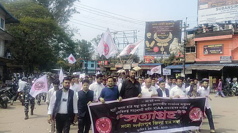 In this context, the Lakhimpur district unit of the leading students’ organization of the State, in association with the 30 ethnic community organizations, demonstrated ‘Satyagrah’ in North Lakhimpur town on Friday demanding the immediate repeal of the controversial Act, the rules of which were notified by the BJP-led government at the Centre by overlooking the extensive protest against it. As part of the Satyagrah, the organizations took out a protest rally from Swahid Bhawan, the district office of the Lakhimpur AASU covering the North Lakhimpur town. Led by Lakhimpur AASU president in-charge Khirod Duwarah and general secretary Swaraj Sankar Gogoi, more than 500 members of the protesting organizations joined the rally. Holding up the constant stand regarding the issue, the protesters reiterated the organizations’ disapproval to the Act and demanded the immediate repeal of the same. AASU central committee sports secretary Simanta Neog, executive member Krisnajyoti Hazarika, Lakhimpur district committee adviser Faridur Rahman, Asom Unnati Sabha vice-president Debojit Mazumder, Asom Sena central committee executive member Jitu Kalita, dignitaries of the ethnic community organizations, AASU subdivisional, regional units took part in the demonstration.