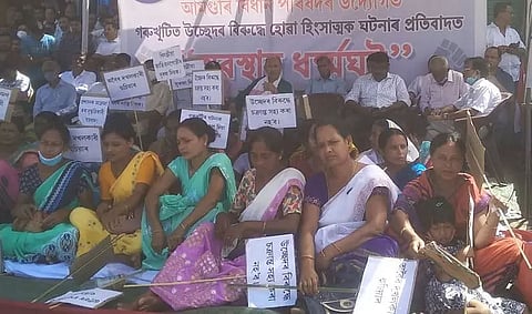 GAURISAGAR: Asom Gana Parishad (AGP) Amguri constituency committee in Sivasagar district staged sit-in at Gaurisagar on Wednesday against the violence during the Gorukhuti eviction drive at Dhalpur in Sipajhar recently.