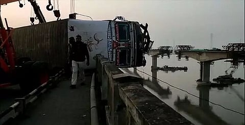 The incident occurred when the truck was heading towards Tezpur from Tinsukia. The truck collided with a freight-carrying vehicle and rammed into the railings. After the collision, the truck remained suspended at the edge of the bridge.