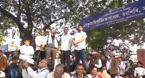 SARUPATHAR: 'Gana Satyagraha' led by All Assam Students' Union (AASU) and 30 other ethnic organizations, over eight thousands of people joined the agitation to register their protest against Citizenship Amendment Act (CAA) in front of the office of the Subdivisional officer, at Sarupathar under Dhansiri Subdivision in Golaghat district. The agitators rent the air with their slogan "Hekh tupal tez dim teu CAA ami namanu" (we will give our last drop of blood but we don't want CAA).