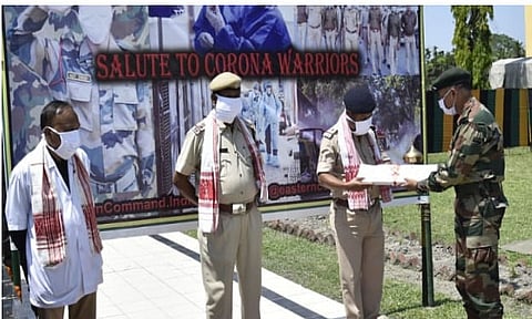 The army offered felicitation on Subdivisional Medical Officer of Patharighat, Dr Syed Atiqul Hoque, Sub Officer of Mangaldai Fire and Emergency services station, Mangaldai ASI Milson Daimary, in-charge of Burha Police outpost, SI Oli Kumar Dusad and media persons Lakshya Dhar Saikia and Pranjal Mahanta with traditional phulam Bihuwan, xarai and face masks stitched by ex-women insurgent cadres.