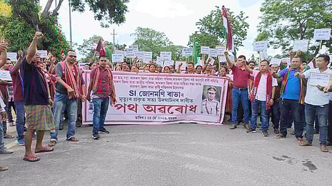 BOKO: The death of SI Junmoni Rabha has caused a stir across the State. Meanwhile, hundreds of members of the All Rabha Students’ Union (ARSU), Sixth Schedule Demand Committee (SSDC), All Rabha Women Council (ARWC), Rabha Sahitya Sabha and other sister organizations blocked the National Highway 17 in Sakhati and simultaneously in Bamunigaon in Kamrup district on Wednesday.