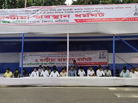 NAGAON: Along with the rest of the state, Nagaon district body of Asom Jatiyatabadi Yuba Chatra Parishad (AJYCP) also staged a three-hour sit-in on Wednesday against the initiative of the State Government to teach Mathematics and Science in English medium from class III.
