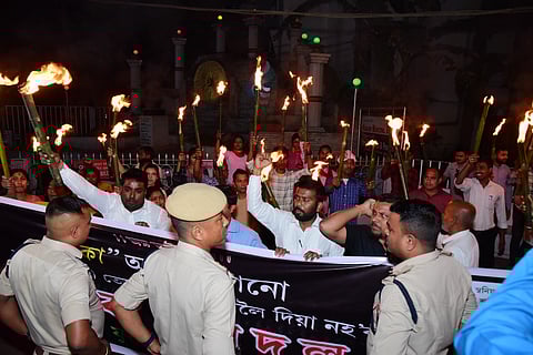 NAGAON: Along with the rest of the State, the district unit of Asom Jatiyatabadi Yuva Chatra Parishad (AJYCP) took out a torch light rally against the implementation of CAA near the Office of the District Commissioner, Nagaon on Saturday evening and filled the air with various anti-CAA slogans.