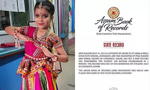 GUWAHATI: 11-year-old Anvi Nagori, a talented Kathak dancer from Guwahati, achieved a remarkable feat by setting a new record for the maximum number of spins in a minute. On June 5, Anvi accomplished 100 spins, earning her a place in the prestigious Assam Book of Records.