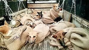 The dogs reportedly belong to the domestic breed of dogs usually found on the streets across the state. The dogs have been seized from the roadside inside sacks, with their legs and mouths tied and only the heads sticking out.
