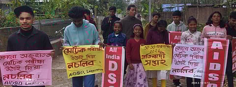 LAKHIMPUR: The Assam State Committee of All India Democratic Students’ Organization (AIDSO) has observed a “Protest Week” as a mark of opposition to the State Government’s moves taken to abolish the HSLC exam (Class X Board Exam) and to introduce English in the schools of the State as the medium of instruction for Science and Mathematics subjects starting from Class VI. By initiating the same protest programme the organization has raised demand to save the government schools of the State.