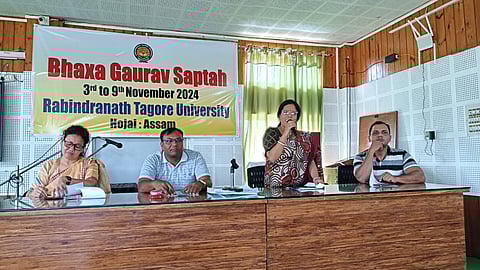 Hojai: ‘Bhaxa Gaurav Saptah’, a week-long programme to mark the celebration of classical language status to Assamese language by the Government of India, concluded at Bharat Tirtho Bhaban, Rabindranath Tagore University in Hojai on Saturday. Prof. Kaushik Chanda, Dean, RTU, graced the occasion as the chairperson of the event. Speaking on the occasion, Prof. Chanda motivated everyone to come up with such programmes in the future. Chanda appreciated the students, teachers, and authority for smoothly organizing the weeklong event. He said this has brought together students from all departments to showcase their talents and learn from each other. He added that the event has fostered a sense of community and camaraderie among the students, and it highlighted the importance of language and innovation in education. Talking to this correspondent on the sidelines of the conclusion ceremony, Dr. Sujit Ranjan Acharjee, Associate Professor of Chemistry and the convener of programme said Rabindranath Tagore University had the privilege of inaugurating Baxha Gaurav Saptah at the Conference Hall of Bharat Tirtho Bhaban, RTU, on November 3 last, to mark the celebration of classical language status to Assamese language by the Government of India. He informed me that the opening ceremony kicked off with a grand celebration, where the Vice-Chancellor, Prof. Manabendra Dutta Choudhury, graced as the chairperson and shared his vision and goals for the programme. He said along with it, other departments played a vital role in organizing the event. He said RTU had centrally organized events such as letter-writing and speech competitions on November 5.