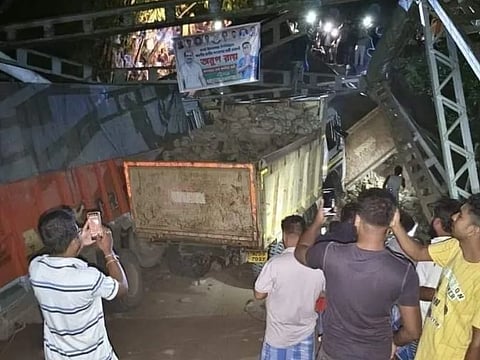 GUWAHATI: Chaos and panic broke out after a vital bridge that connected Assam and Mizoram collapsed around midnight, leaving three trucks stuck amidst a heart-stopping scenario. Two dumpers heavily loaded with stones meant for construction on the Bhaga-Sherkhan link road were crossing the bridge when disaster struck. The structure simply gave way, leaving the two trucks perilously suspended in mid-air above the river below.