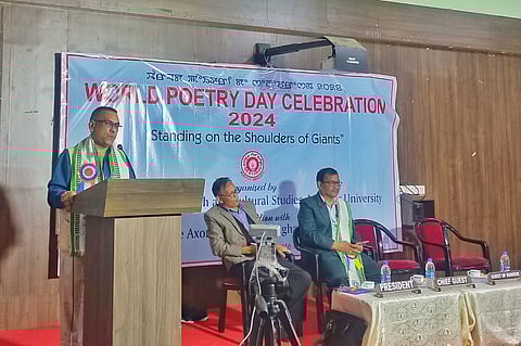 BISWANATH CHARIALI: The Department of English and Cultural Studies, Manipur University organized the World Poetry Day celebration, 2024 with the theme, “Standing on the Shoulders of Giants” on Thursday at the Senate Hall, Manipur University. The event was graced by Prof L Lokendra Singh, Vice- Chancellor, Manipur University as the chief guest, Diganta Biswa Sarma, Professor of Practice, Dibrugarh University and Prof Soibam Imoba Singh, Department of Linguistics and Dean of Humanities, Manipur University as the guests of honour along with the president of the event, Prof Irom Gambhir Singh, Head, Department of English and Cultural Studies, Manipur University.