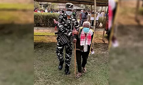 "Always by your side! A moving visual that captures the humane spirit and compassion of a policeman - facilitating an elderly voter in the ongoing Assam Assembly Polls," Assam Police said on Twitter.