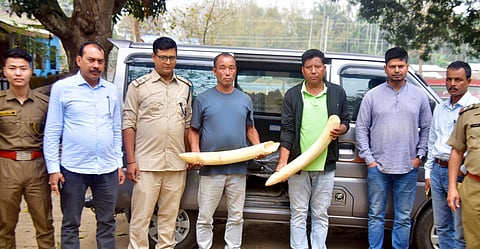 Boko: A team of the Directorate of Revenue Intelligence (DRI), Guwahati, recovered two pieces of ivory (total 14 kilograms) from Khatira village near Bamunigaon in Boko on Friday night along with arresting two persons and handing them over to the Bamunigaon Forest Office under the West Kamrup Forest Division. The smugglers were arrested by a team of the DRI on a tip-off on Friday night, Bamunigaon Forest Officer Aminul Islam said. The arrested were identified as Suren Rabha of Barbakra in Chaygaon and Shankar Boro of Chakrapani in Boko, respectively. The smugglers were smuggling the teeth at Rs 27,000 per kg, Forest Officer Aminul Islam said. The accused is being questioned at the Bamunigaon Forest Office. The arrested individuals have been booked under multiple sections of the Wildlife (Protection) Act, 1972, including Sections 39(01, 5), 40(1, 2, 2B), 44, 48A, and 49, all of which are punishable under Section 51 of the Act.