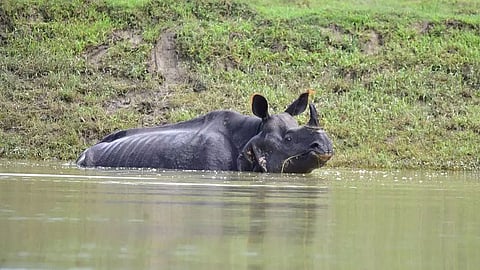 Vast tracts of land In Kaziranga in low-lying areas remain inundated. Many forest camps are reeling under water, even as roads leading to the interiors of the park remain submerged.