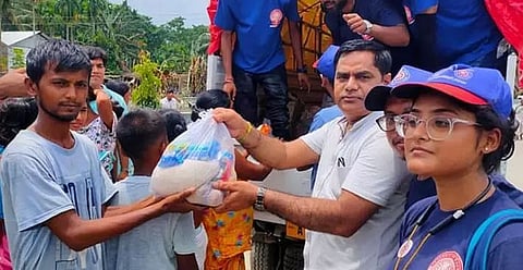 MANGALDAI: Volunteers of Gauhati University (GU) Campus National Social Service (NSS) led by Dr. Ranjan Kr. Kakati, Director, Students' Welfare & Programme coordinator, NSS Cell, GU and Dr Rituparna Borah, NSS PO, showing solidarity towards the flood-affected villagers have come forward on Sunday to extend their helping hands to the people of Rangamati Gaon Panchayat area- the worst flood-hit area of Darrang district. The team of 17 young volunteers distributed packets of dry foods in addition to sanitary pads, candles, mosquito repellent coils etc to nearly 250 families of villages namely Niz Rangamati, Choto Nagaon and Bor Nagaon. Talking to this correspondent Programme coordinator, NSS Cell, GU, Dr Kakati said that this mission could be made successful with the voluntary contribution of the GU family including its Vice-Chancellor Prof. Pratap Jyoti Handique, faculty members, all the hostel boarders, few officers and the student fraternity.