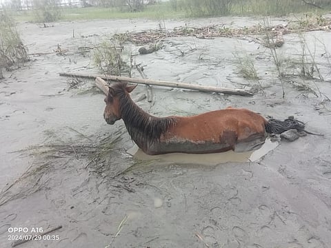 Hundreds of wild horses from Dibru Saikhowa National Park have been swept away by the devastating floodwaters of the Brahmaputra River over the years. Now stranded at Bogibeel in Dibrugarh, these rare species are facing severe threats to their survival. Many horses are struggling with sickness, hunger, and exhaustion, with several already succumbing to these harsh conditions. The forest departments of Dibrugarh and Tinsukia districts are unable to provide the necessary support to protect these endangered animals, leaving them vulnerable to the elements and local threats. A wild horse stranded in the sand was rescued by local people and local people have raised concerns regarding the future and well-being of the wild horses living here.