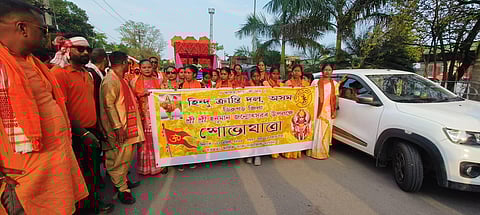 The members participated in the rally with colourful attire. Women and children participated in the procession chanting “Jai Sri Ram, Jai Hanuman”.