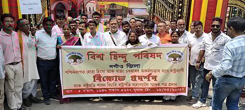 NAGAON: The Nagaon district unit of Viswa Hindu Parishad (VHP) staged a protest against the recent violent incidents in Murshidabad, West Bengal, and demanded immediate imposition of President’s rule in West Bengal on Saturday.